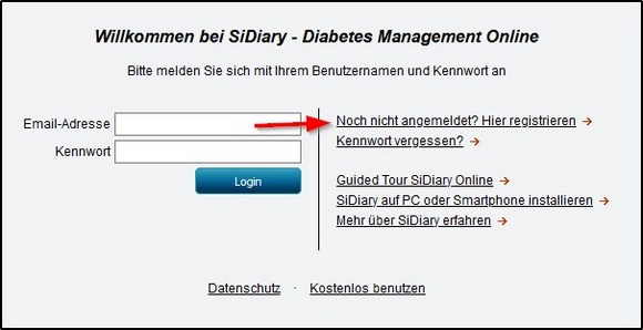 1. SiDiary-Online einrichten:Falls Sie noch kein Konto bei SiDiary-Online haben sollten Sie das jetzt einrichten. Falls Sie die Seite in englisch sehen können Sie sie mit einem Klick auf die Deutsche Flagge rechts oben auf deutsch umschalten. Klicken Sie dann auf den Link 'Noch nicht angemeldet? Hier registrieren'.