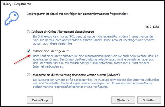 Falls Sie einen SiDiary USB-Stick erworben haben, finden Sie die Transaktionsnummer, indem Sie SiDiary auf dem Stick starten und dann ins Menü 'Hilfe ->Registrieren' wechseln.