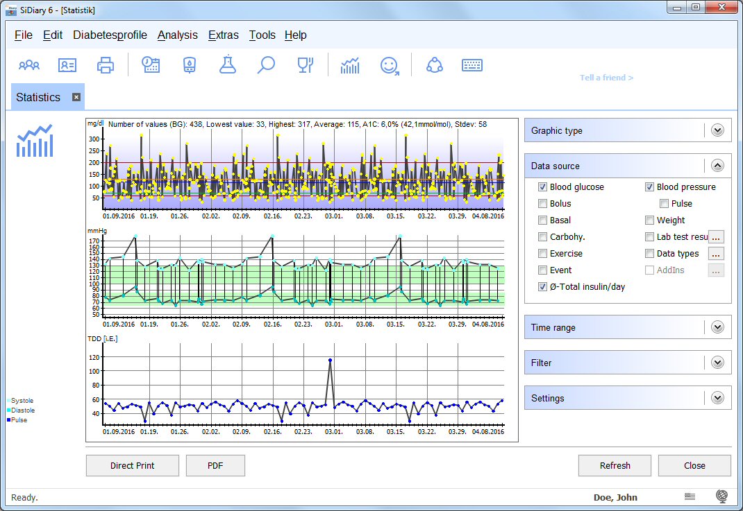 Diabetes-Software SiDiary: Statistics You can analyze your data with detailed statistical graphs. You can filter the events, time range, control times and s on. The times for these control times (Before breakfast, after lunch, etc.) can be specified also at the menu 'Diabetesprofile ->Control Times'. The A1c interpolation can only be used, if you have selected a bolus insulin with a effect profile. With this option the calculated A1c will be much more realistic and closer to the A1c values coming from your lab. With the arrow buttons in the time range you can move the analyzed time range, i.e. to compare a weekly data basis.