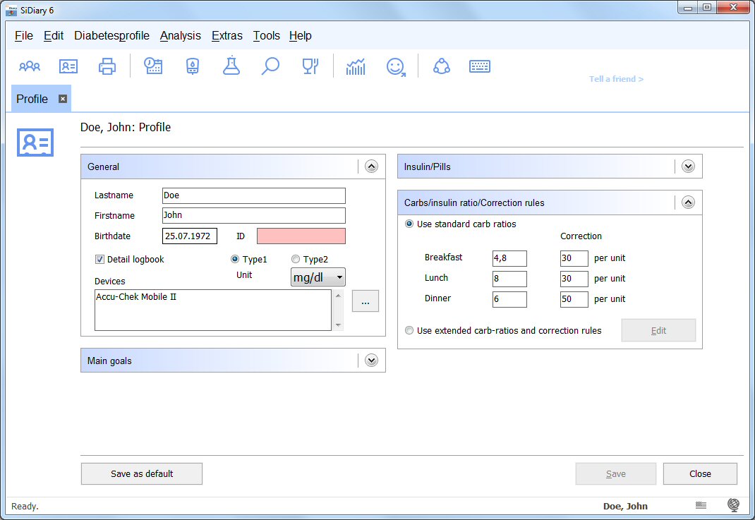 Diabetes-Software SiDiary: Your diabetes profile Some functionalities (i.e. bolus dose calculation) need a configured diabetic profile, which you can set-up on the profile tab or within the profile wizard. Please find below some information about how to enter the correct ratios and correction rules.