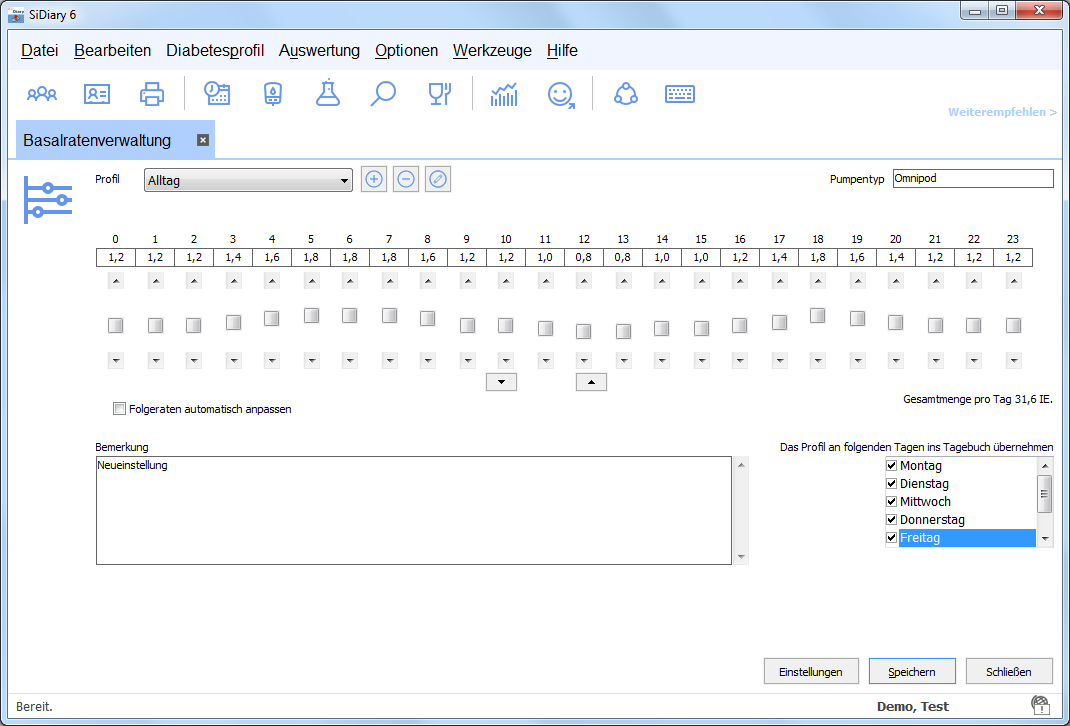 SiDiary unterstützt beliebig viele Basalratenprofile. Dies ist insbesondere für Menschen mit Wechselschicht oder verschiedenen Anforderungen an Wochentagen und Wochenenden interessant. Sie können SiDiary mitteilen, an welchem Tag sie welches Profil nutzen; die Gesamtsumme dieses Profils wird dann automatisch für diesen Tag vorab eingetragen.