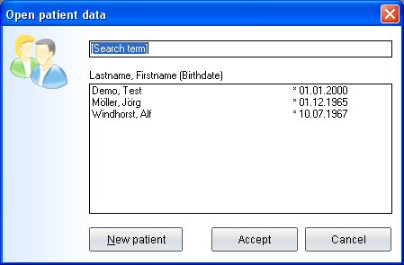 Use this screen to select an already existing patient. Mark the patient in the list by clicking on the name and press the button Accept. All already opened masks, for example the statistic screen switch automatically to the selected new patient. It is not necessary to close all sub windows, in order to select a different patient. Please see also chapter 6.3.9 'Recently opened patients' or the 'Search' function in chapter 6.4.6.