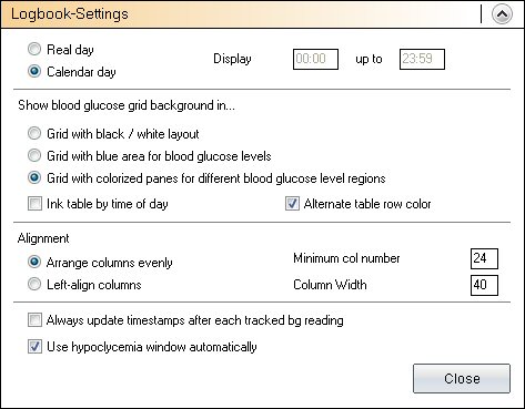 Select the setting “Real Day”, in order to see values from a whole day in the logbook, although the entered date of the injection or blood glucose measuring was located already at the following calendar day.