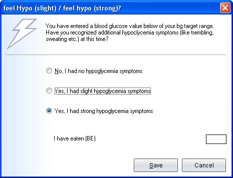 In this screen you can select if you sensed / noticed the low sugar symptoms or not and how many carbs you ate then. After a click on Save this information will be saved in the logbook.