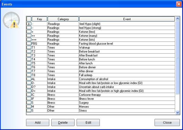 In the screen Events you can edit events and relate them to data records that you already entered in your logbook. SiDiary provides several standard events that you can adjust as you like. You can also edit the categories.