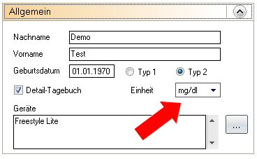 Selbstverständlich unterstützt unsere Software das Arbeiten sowohl in mmol/l als auch in mg/dl! Sie können die Einheit im Menü 'Diabetesprofil ->Therapiedaten ->Allgemein' einstellen.