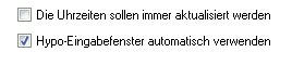 Wenn Sie diese Option aktivieren trägt SiDiary bei jeder Eingabe (nur beim aktuellen Tag!) die aktuelle Systemzeit automatisch ein. Wählen Sie diese Option, wenn Sie Ihre Werte immer sofort eingeben, z.B. in einem mobilen Gerät wie einem Pocket PC und auf Ihrem Handy oder auch tagsüber am PC. Dies geschieht jedoch auch, wenn Sie z. B. erst abends einen Meßwert eintragen, den Sie bereits am morgen gemessen hatten.